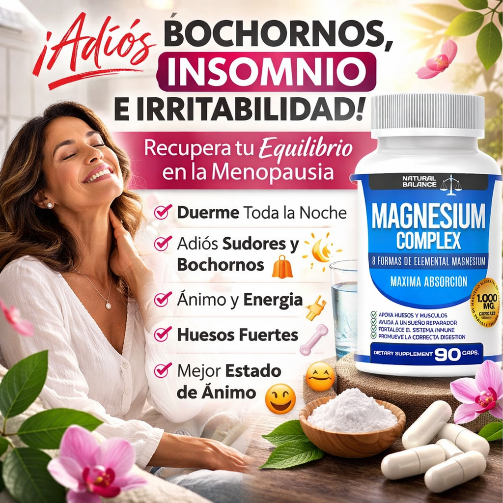 Su fórmula con 8 tipos de magnesio de alta absorción ayuda a reducir la fatiga, mejorar el ánimo y acompañar tu bienestar en la etapa de menopausia. 🌿